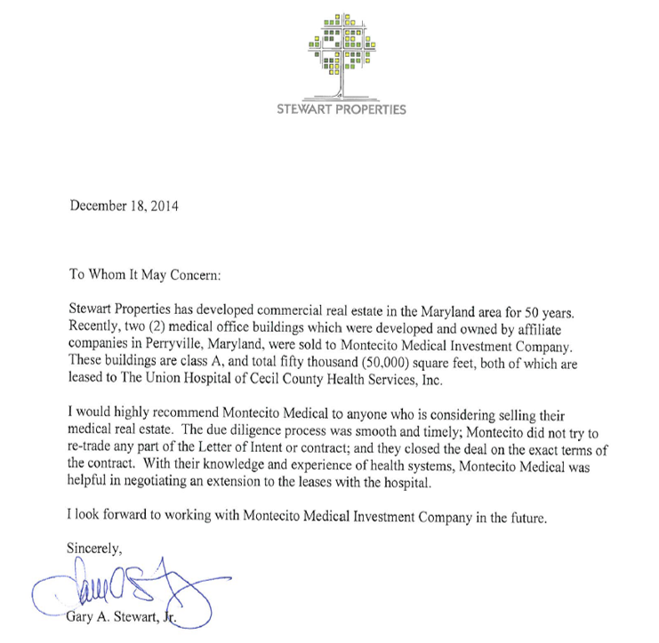 I would highly recommend Montecito Medical to anyone who is considering selling their medical real estate. The due diligence process was smooth and timely; Montecito did not re-trade any part of the Letter of Intent or contract; and they closed the deal on the exact terms of the contract. With their knowledge and experience of health systems, Montecito Medical was helpful in negotiating an extension to the leases with the hospital.
