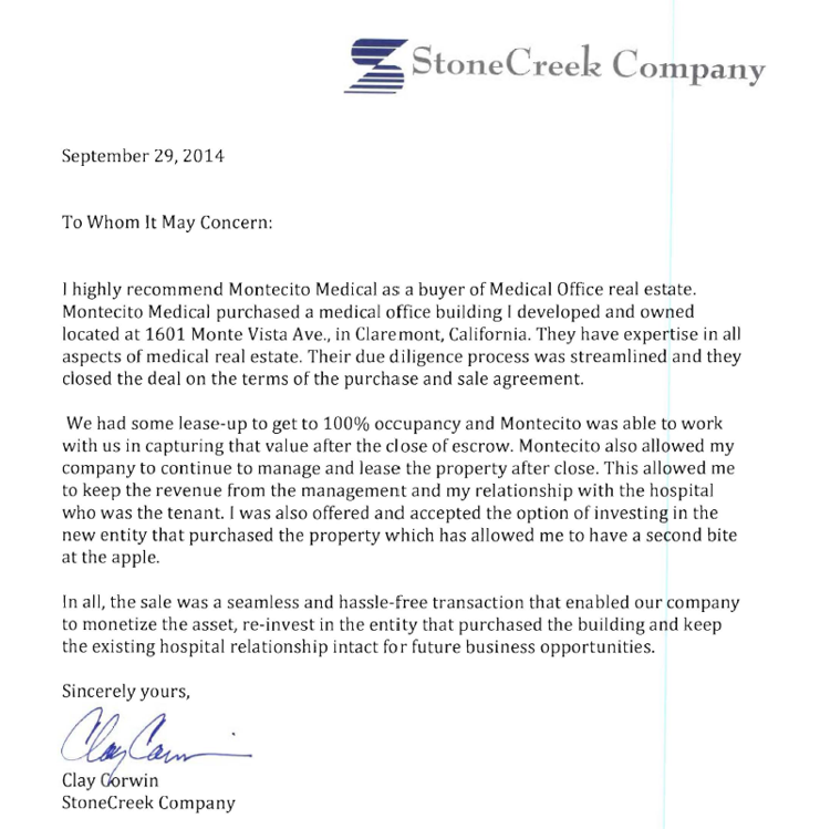 Any owner considering selling their medical offices would be fortunate to have Montecito Medical as a buyer. We valued Montecito’s reasonable due diligence process, and that they closed the deal on the terms of the purchase and sale agreement.