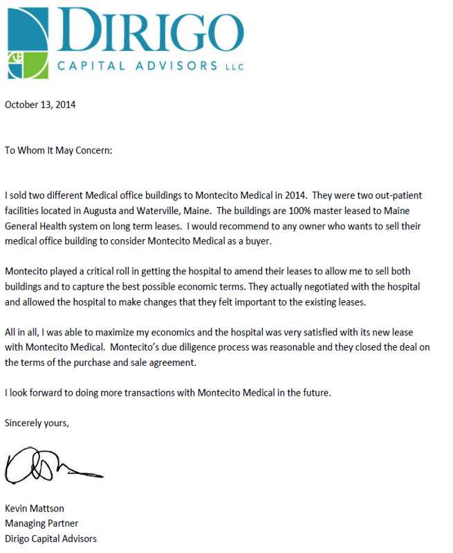 Any owner considering selling their medical offices would be fortunate to have Montecito Medical as a buyer. We valued Montecito’s reasonable due diligence process, and that they closed the deal on the terms of the purchase and sale agreement.