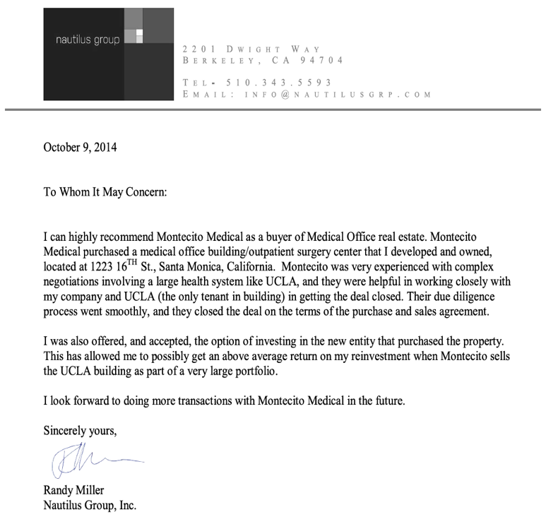 Montecito was very experienced with complex negotiations involving a large health system like UCLA, and they were helpful in working closely with my company and UCLA (the only tenant in the building) in getting the deal closed…. I look forward to doing more transactions with Montecito Medical in the future.